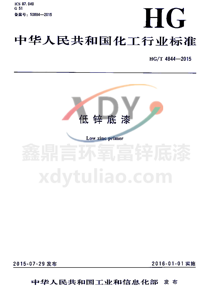 ICS 87.040 G51 備案號:50884-2005 HG 中華人民共和國化工行業標準 HG/T 4844-2015 低鋅底漆Low zinc primer 2015-07-29發布 2016-01-01實施 中華人民共和國工業和信息化部 發布 本標準規定了低鋅底漆的產品分類、要求、試驗方法、檢驗規則、標志、包裝和貯存。本標準適用于不揮發分中金屬鋅含量低于60%但不低于40%的低鋅涂