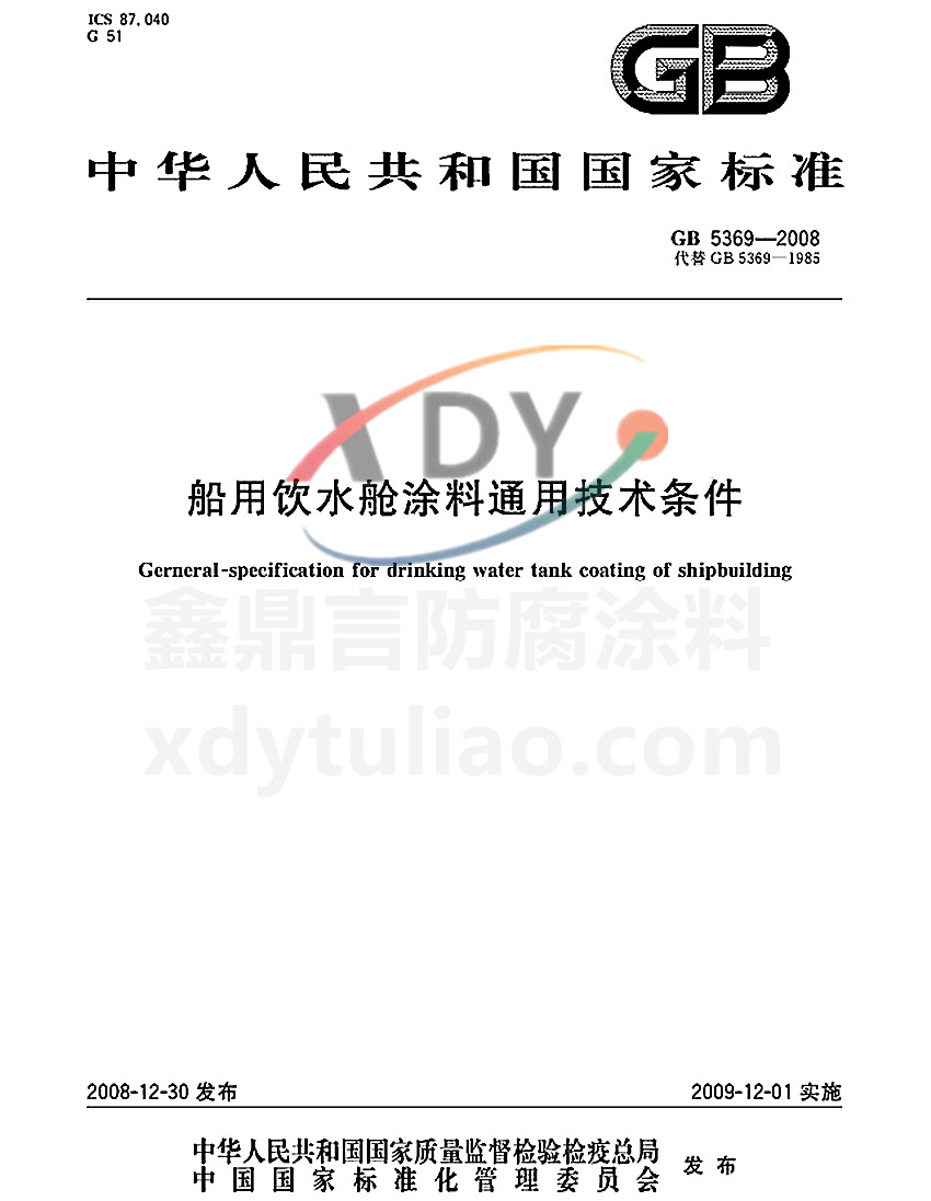 ICS87.040 G51 GB 中華人民共和國國家標準 GB 5369-2008代替GB 5369-1985 船用飲水艙涂料通用技術條件 Gerneneral-specification for drinking wanter tank coating of shipbuilding 2008-12-30發布 2009-12-01實施 中華人民共和國國家質量監督檢驗檢疫總局 中國國家標準化管理