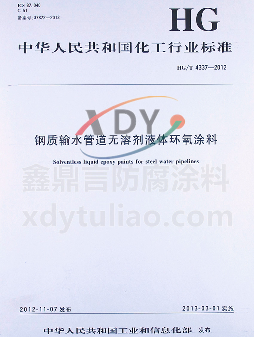 HG/T4337-2012鋼質輸水管道無溶劑液體環氧涂料標準 ICS 87.040 G51 備案號:37872-2013 HG 中華人民共和國化工行業標準 HG/T4337-2012鋼質輸水管道無溶劑液體環氧涂料Solventless liquid epoxy paints for steel water pipelines 2012-11-07發布 2013-03-01實施 中華人民共和國工業和