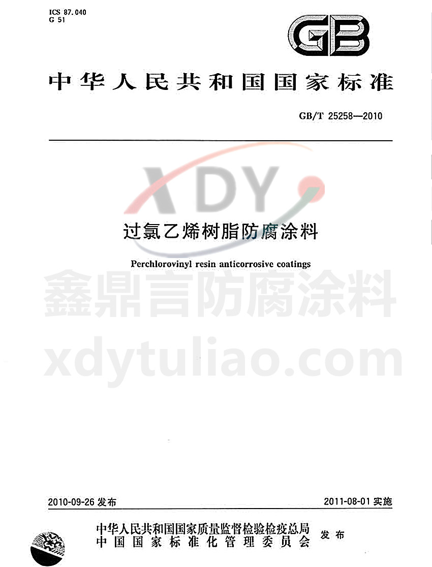 過氯乙烯樹脂防腐涂料國家標準GB/T25258-2010 ICS87.040 G51 GB 中華人民共和國國家標準 GB/T 25258-2010過氯乙烯樹脂防腐涂料Perchlorovinyl resin anticorrosive coatings 2010-09-26發布 2011-08-01實施 中華人民共和國國家質量監督檢驗檢疫總局 中國國家標準化管理委員會 發布 本標準規定了過氯乙烯樹