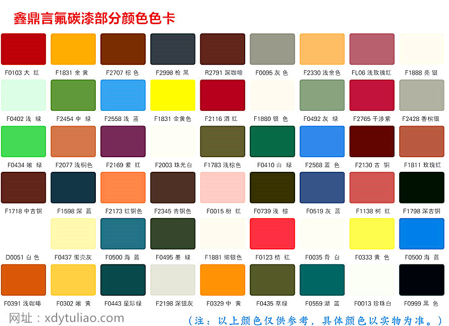 D、氟碳漆色卡適用于XDY-F氟碳漆系列:金屬氟碳漆外墻氟碳漆、鋼結構氟碳漆、氟碳面漆水性氟碳漆、氟碳防腐漆等金屬漆選色。