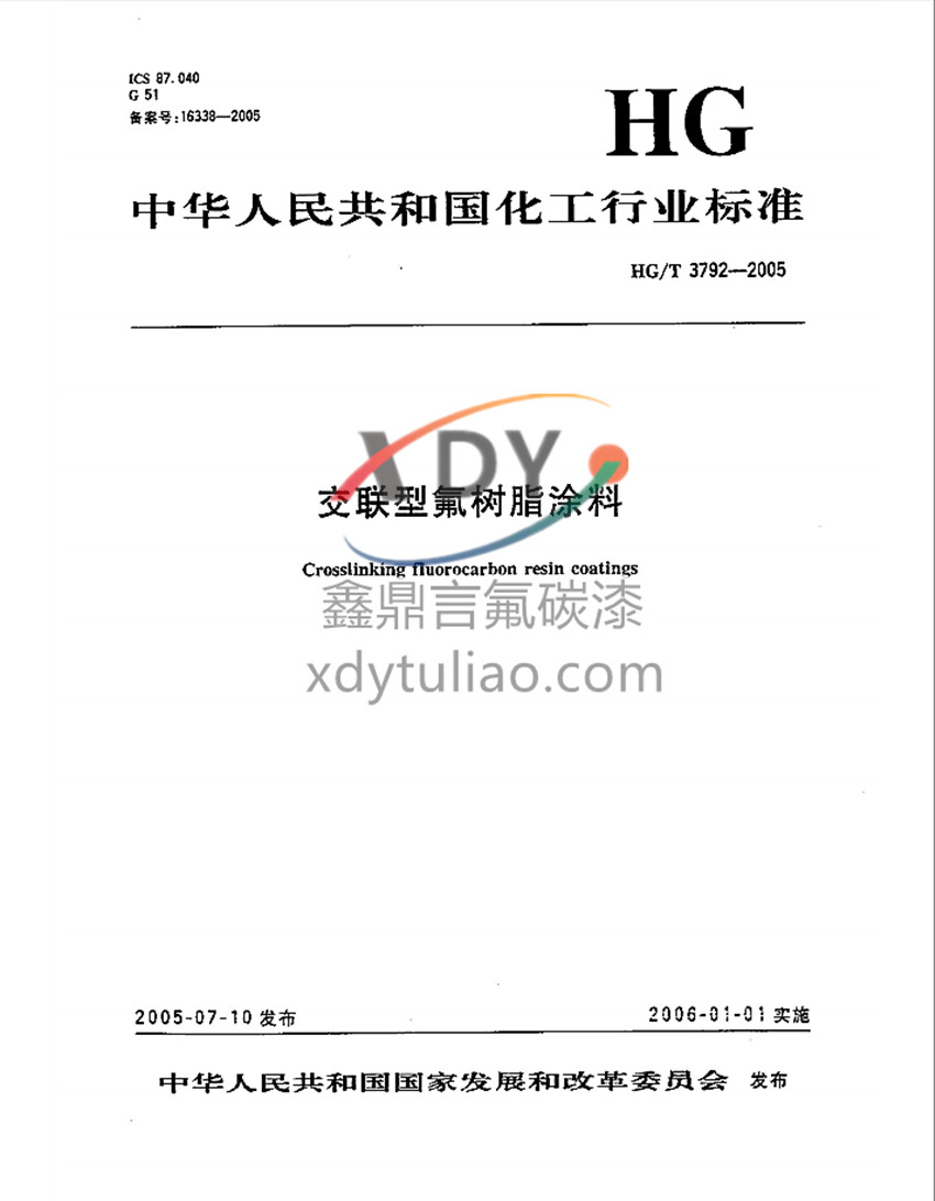 中華人民共和國化工行業標準HG/T3792-2014交聯型氟樹脂涂料替代HG/T3792-2005 本標準根據交聯型氟樹脂涂料的主要應用領域分為3種類:Ⅰ型為建筑外墻用氟樹脂涂料;Ⅱ型為橋梁、儲罐等混凝土設施表面用氟樹脂涂料;Ⅲ型為鋼結構等金屬表面用氟樹脂涂料。 常溫交聯型氟碳漆按化工行業標準HG/T3792-2014交聯型氟樹脂涂料執行,性能達到標準中的技術要求
