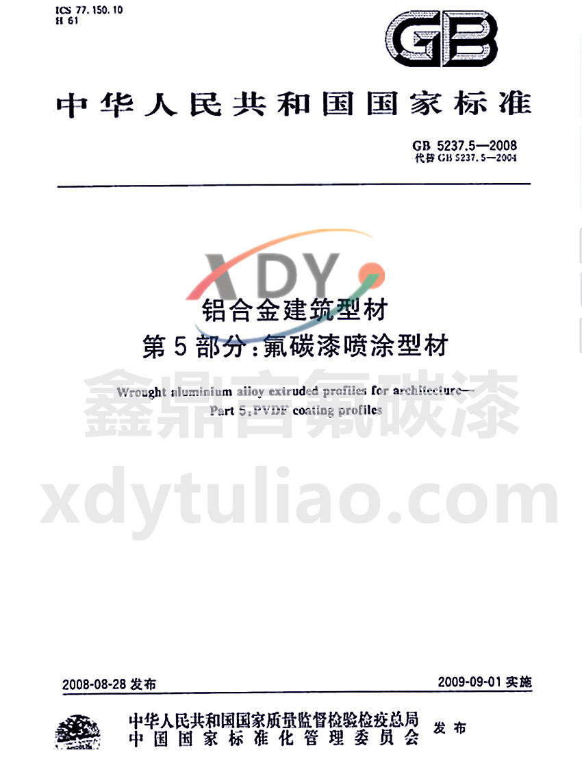 GB 5237.5-2008鋁合金建筑型材 第5部分:氟碳漆噴涂型材 中華人民共和國國家標準 GB 5237.5-2008代替GB 5237.5-2004 鋁合金建筑型材 第5部分:氟碳漆噴涂型材 Wrought aluminum alloy extruded profiles for architecture-Part5:PVDF coating profiles 中華人民共和國國家質量監督檢