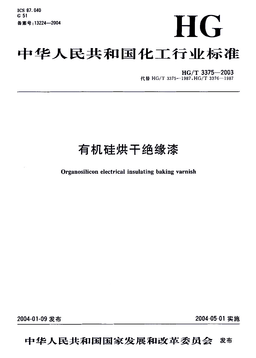 HG/T 3375-2003有機(jī)硅烘干絕緣漆標(biāo)準(zhǔn) ICS87.040 G51 備案號:13224-2004 HG 中華人民共和國化工行業(yè)標(biāo)準(zhǔn) HG/T 3375-2003代替 HG/T 3375-1987,HG/T 3376-1987 有機(jī)硅烘干絕緣漆Organosilicon electrical insulating baking varnish 2004-01-09發(fā)布,2004-