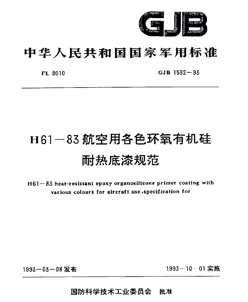 H61-83航空用各色環(huán)氧有機(jī)硅耐熱底漆規(guī)范標(biāo)準(zhǔn)GJB 1592-93 GJB 中華人民共和國國家軍用標(biāo)準(zhǔn) FL8010 GJB 1592-93 H61-83航空用各色環(huán)氧有機(jī)硅耐熱底漆規(guī)范 H61-83 Heat-resistant epoxy organosilicnne primer with coating with various colours for aircraft use,sp