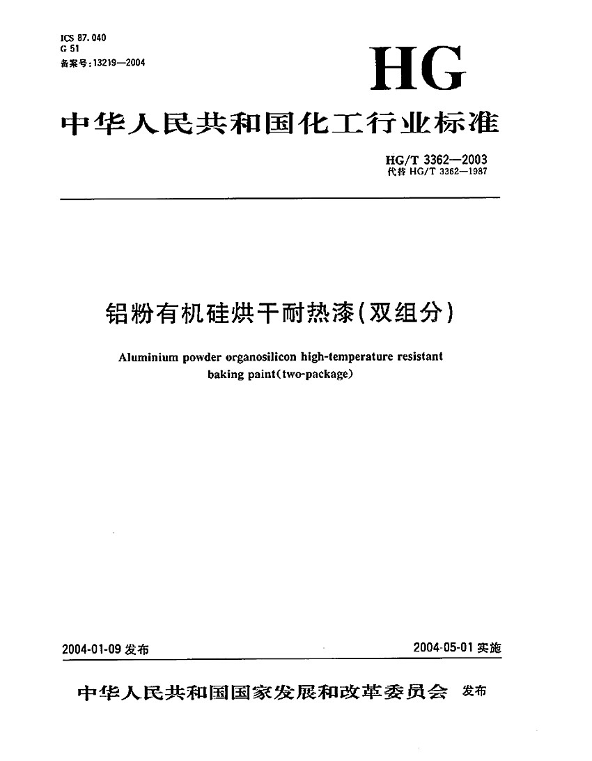 有機(jī)硅耐高溫漆標(biāo)準(zhǔn)HG/T3362-2003 ICS 87. 040 G 51 備案號:13219-2004 HG 中華人民共和國化工行業(yè)標(biāo)準(zhǔn) HG/T 3362-2003代替 HG/T 3362-1987 鋁粉有機(jī)硅烘干耐熱漆(雙組分) Aluminium powder organosilicon high-temperature resistant baking paint(two-