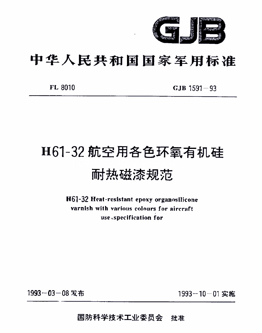 H61-32各色環(huán)氧有機(jī)硅耐熱磁漆標(biāo)準(zhǔn)GJB 1531- 93 GJB 中華人民共和國國家軍用標(biāo)準(zhǔn) FL8010 GJB 1531- 93 H61- 32航空用各色環(huán)氧有機(jī)硅耐熱磁漆規(guī)范 H61-32 Heat-resistant epoxy organosilicnne vrnish with various colonrs fnraircrufl use speciflc