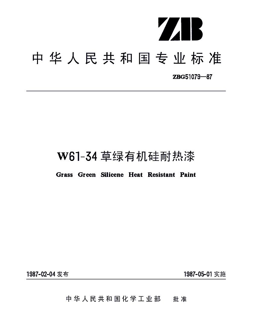HG/T 3361-1987 W61-34草綠有機(jī)硅耐熱漆標(biāo)準(zhǔn)ZBG51079-87(代替HG 2-637-74) ZB 中華人民共和國專業(yè)標(biāo)準(zhǔn) ZBG51079-87 W61-34草綠有機(jī)硅耐熱漆Grass Green Silicene Heat Resistant Paint 1987-02-04發(fā)布,1987-05-01實(shí)施 中華人民共和國化學(xué)工業(yè)部 批準(zhǔn) ZBG51079-87代替HG 2