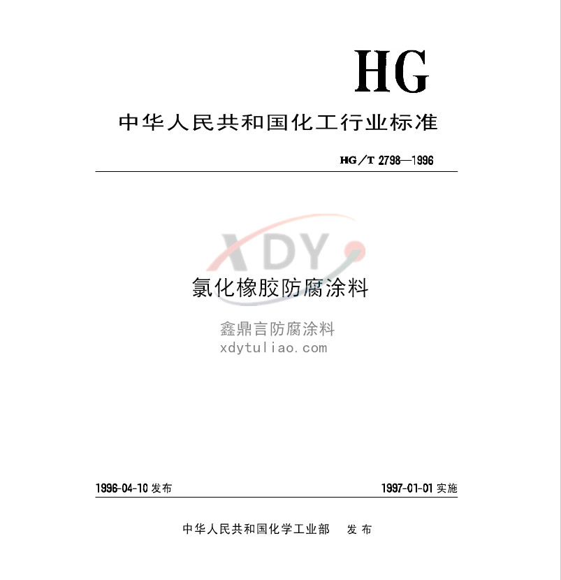 氯化橡膠防腐涂料標準HG/T2798-1996:本標準規定了氯化橡膠防腐涂料產品的要求、試驗方法及標志、標簽、包裝。本標準適用于以氯化橡膠為漆基,加入其它合成樹脂、顏料、溶劑等制成的氯化橡膠底漆、中間層漆、面漆防腐涂料。
