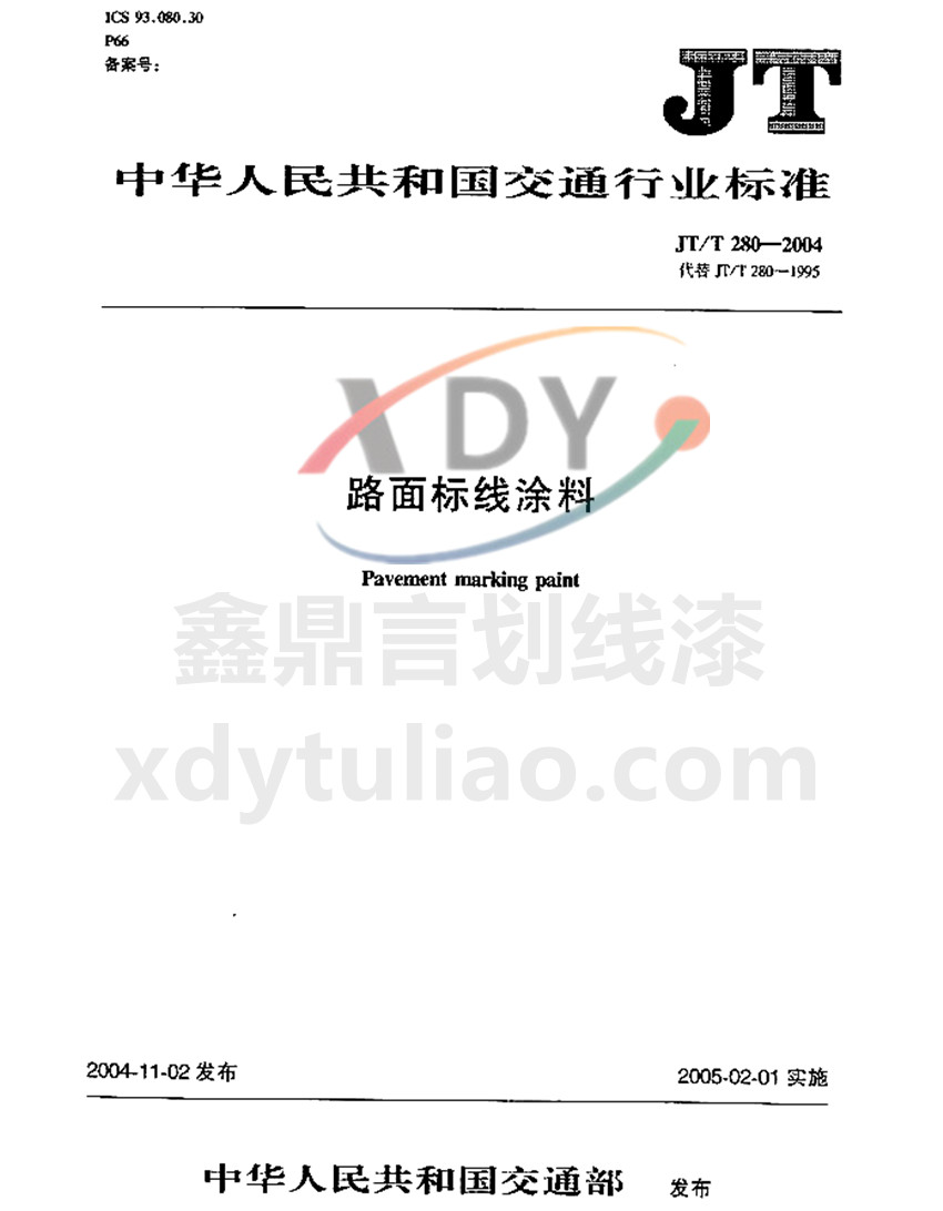 JT/T 280-2004路面標線涂料標準是防腐涂料小編照搬JT/T 280-2004《路面標線涂料》紙質版內容,大家可以放心參考。更多防腐涂料執行國家和行業標準等防腐涂料相關信息可以參考官網:m.88diankaolu.com ICS 93.080.30 P66 JT 中華人民共和國交通運輸行業標準 JT/T 280-2004路面標線涂料Pavement