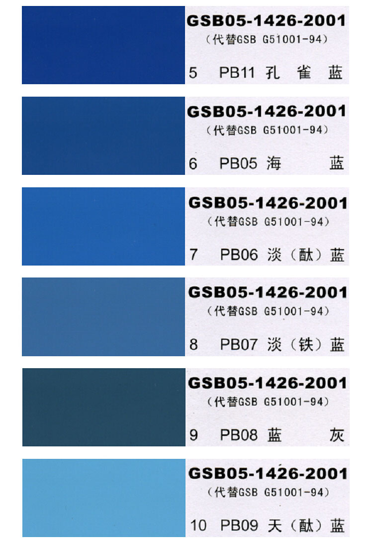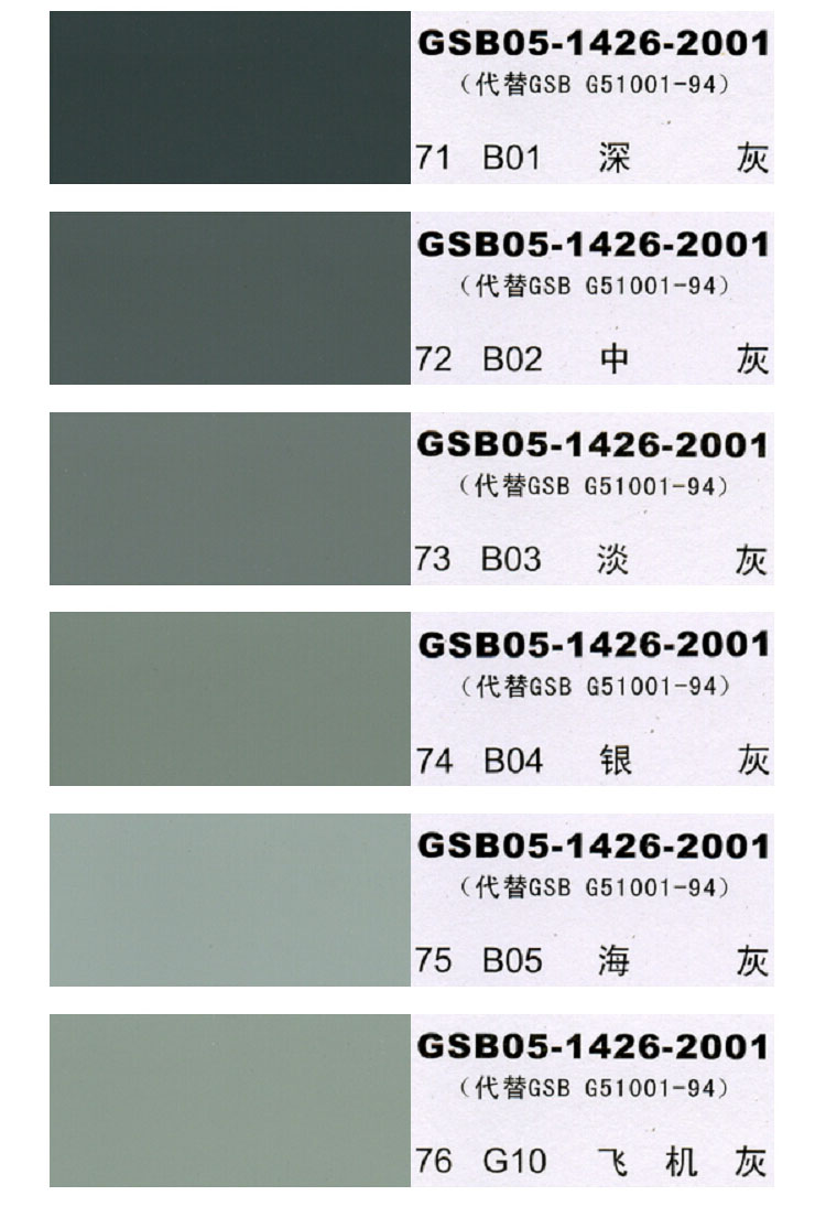 4、本國標色卡(GSB05-1426-2001)適用于定做博凱防腐涂料廠生產的XDY防腐漆系列:氟碳漆、石墨烯漆、納米漆、聚氨酯漆、丙烯酸漆、環氧面漆、氯化橡膠漆、氯磺化聚乙烯漆、高氯化聚乙烯漆等可調色防腐漆品種。